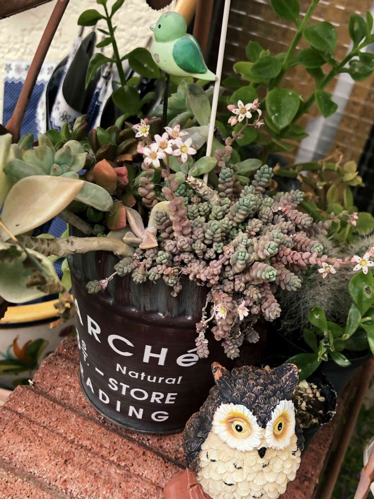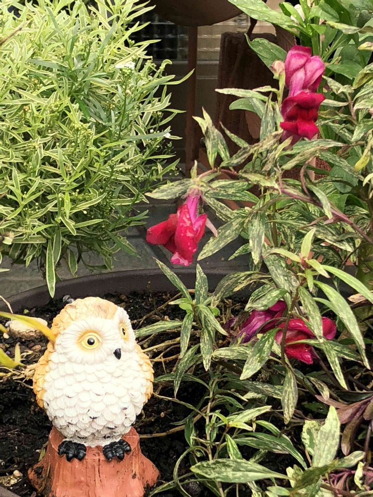 ②同じく玄関前の寄せ植え鉢にもフクロウさん🦉居ました。