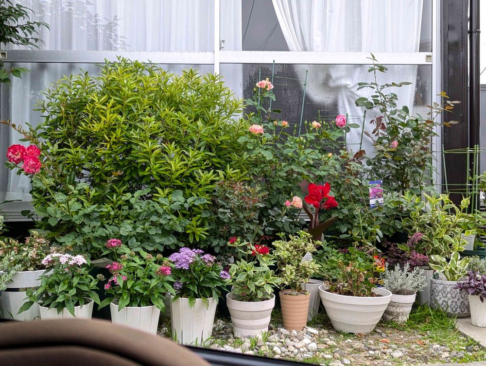 5枚目はマイカーの助手席からみた植物ゾーン😊カンナの花のおかげでなんとなく華やかになりました🫶