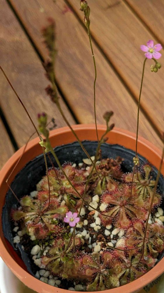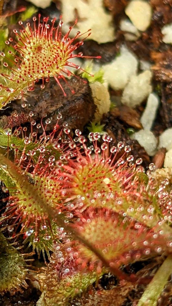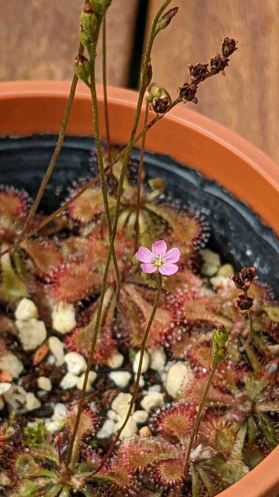 モウセンゴケは虫媒花なので可愛らしいお花に引き寄せられて やってきた虫が葉にひと休み…と思ったらくっついちゃった🪰💦みたいな感じでしょうか…😅😂