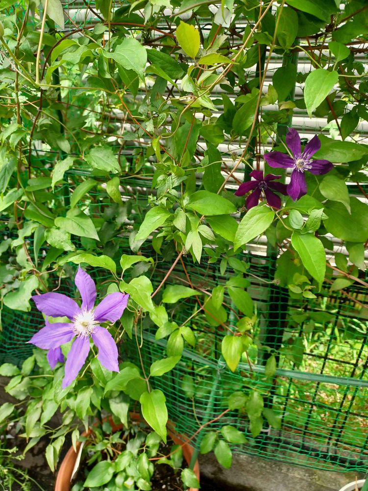 四季咲きクレマチス、HFヤングとビクターヒューゴ 大きいのと小さいの。かざぐるまのよう