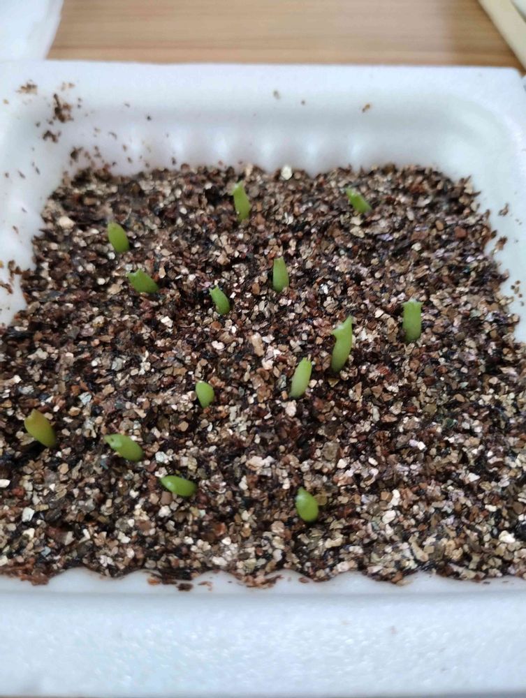 昨年収穫した種は発芽し育て中。ただ、いつのタイミングで植え替えるのか、だいぶ溶けて消えてしまいました、、、