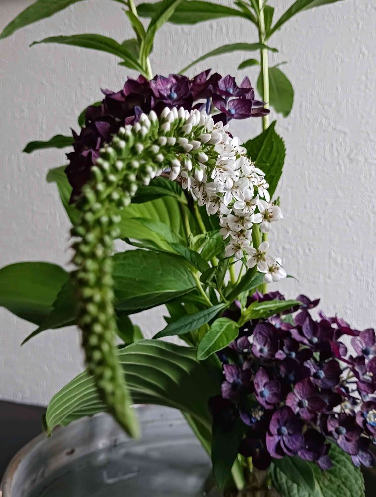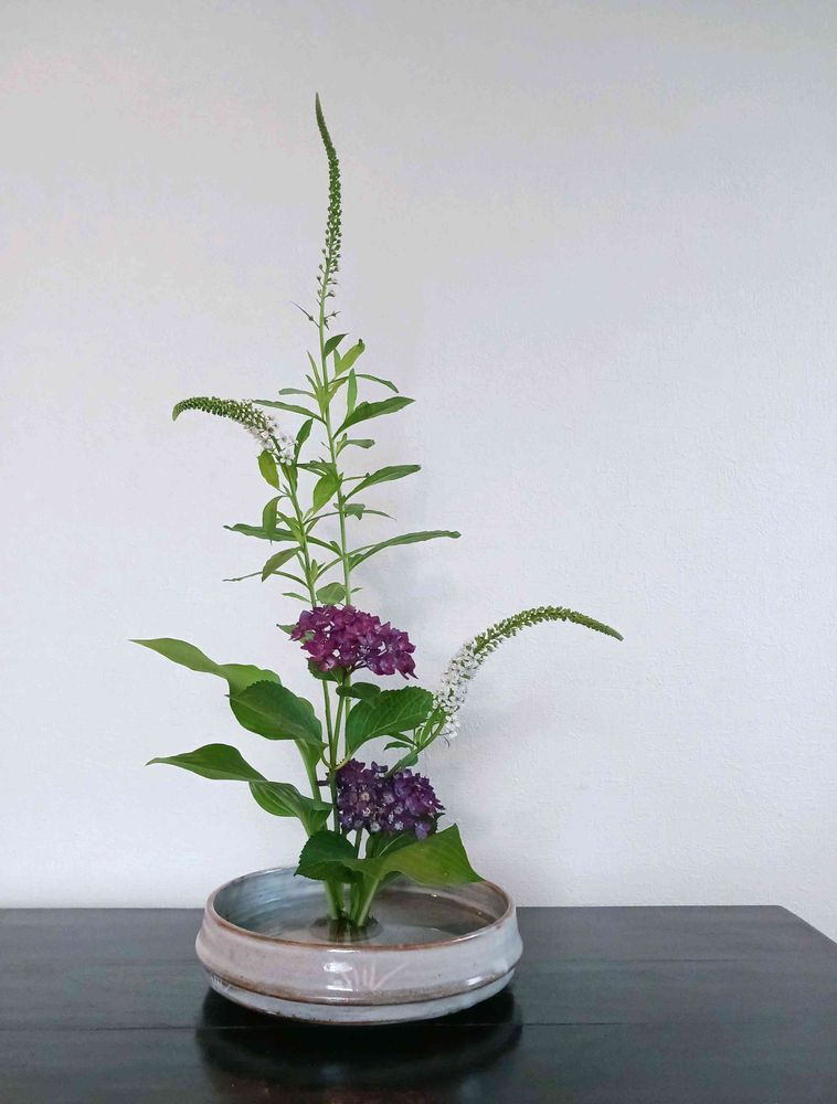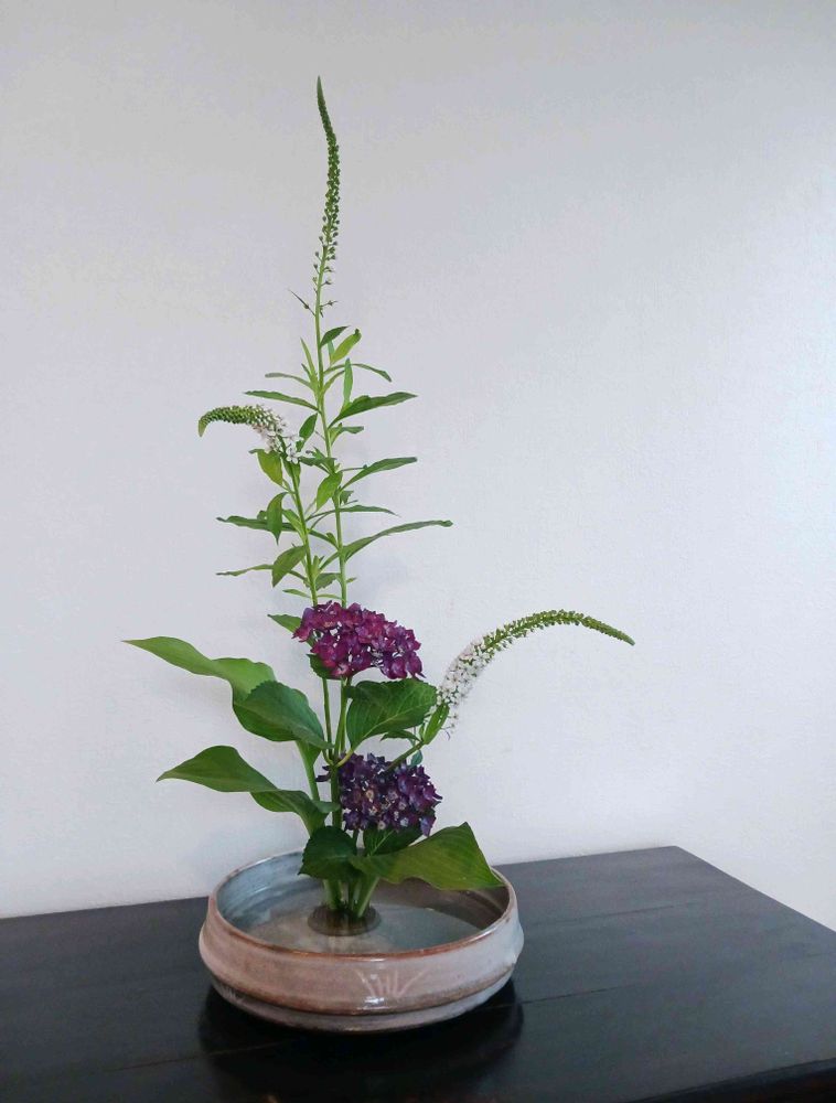 最初は下の方、オカトラノオとギボウシと紫陽花の葉っぱがごちゃついていたのです。しばらく眺めて、撮った写真を眺めて🤔、、、先生の水盤作品をまたじっくり見させていただきました。