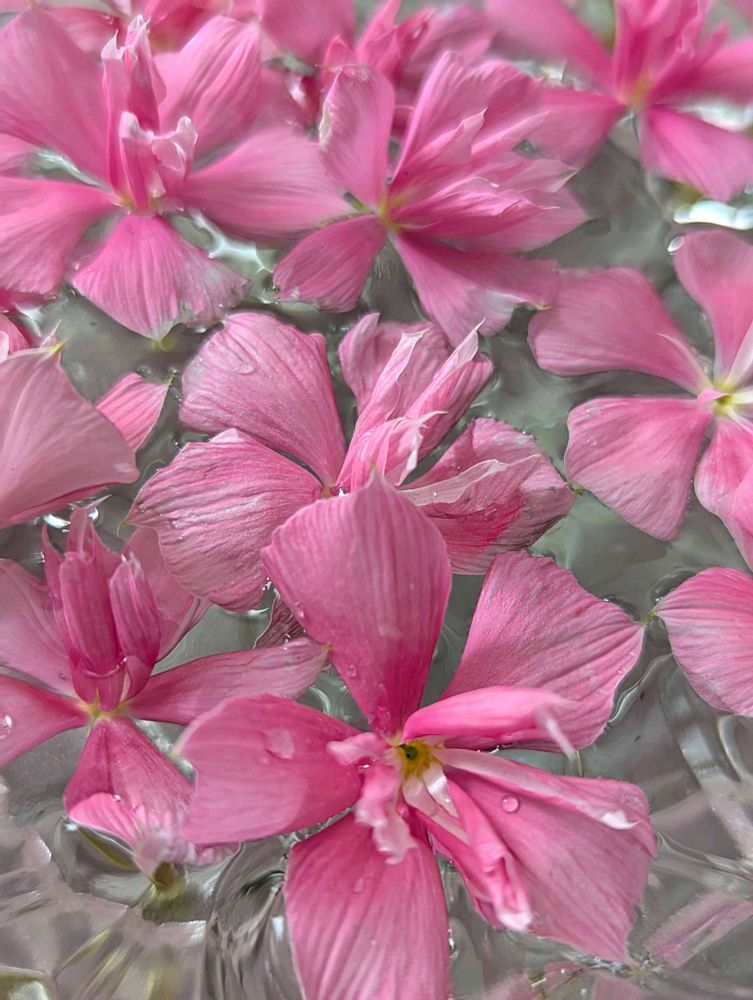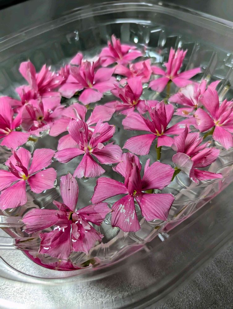 朝 雨が上がっていて外のお花を見に出たらニチニチソウのサニープリンセスがたくさん落ちていて まだキレイだったのでプラスチックのパックに水を張り浮かべてみました🌸