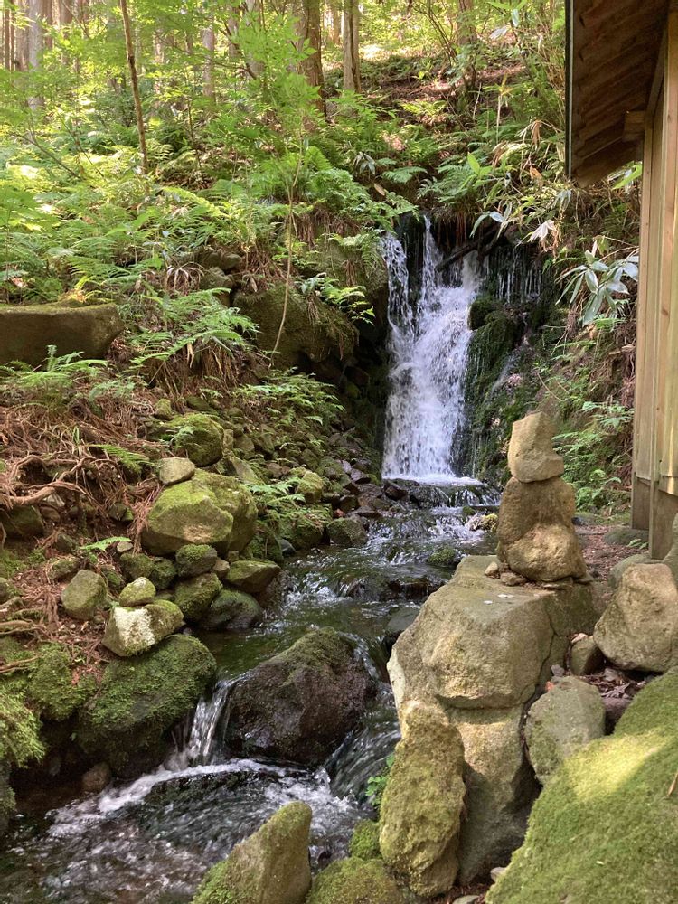 右側の重ねてある石は、滝の方を向いて座っている昔人のように見えてきました。