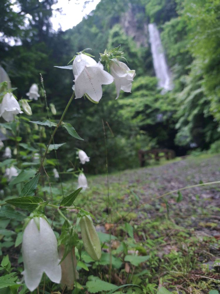 白のホタルブクロと滝、涼しげ😆