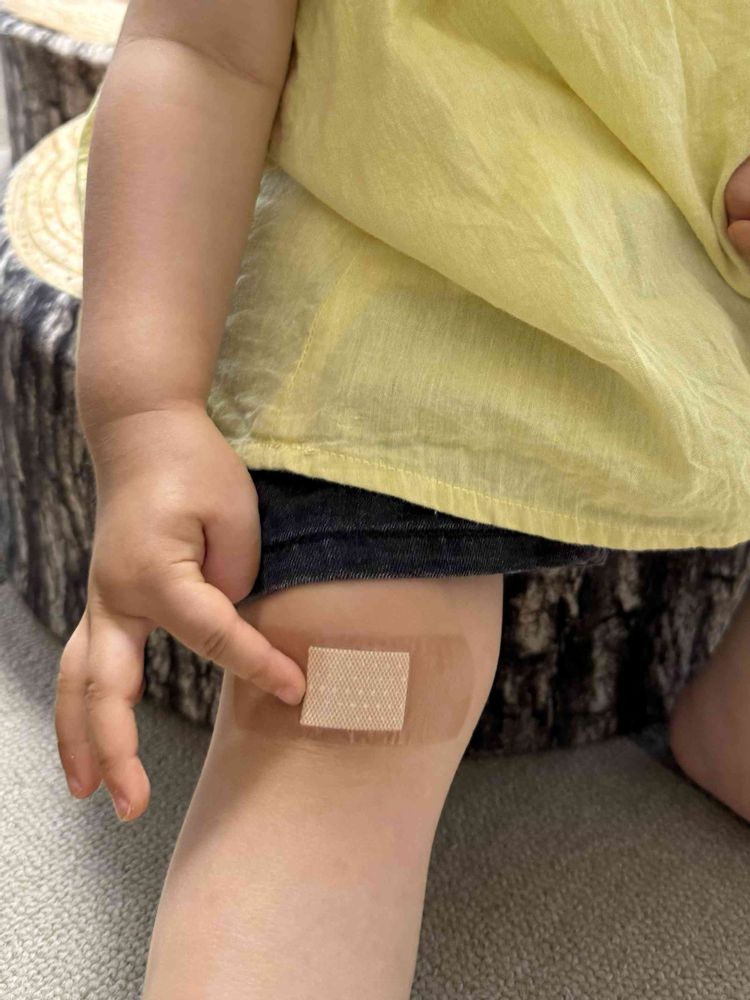 初めての絆創膏、痛いから剥がさずに『治れ〜治れー』って言ってあげたら痛み忘れたみたい😅