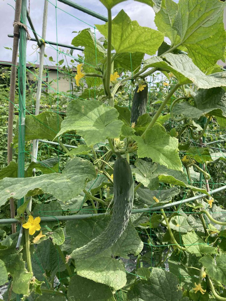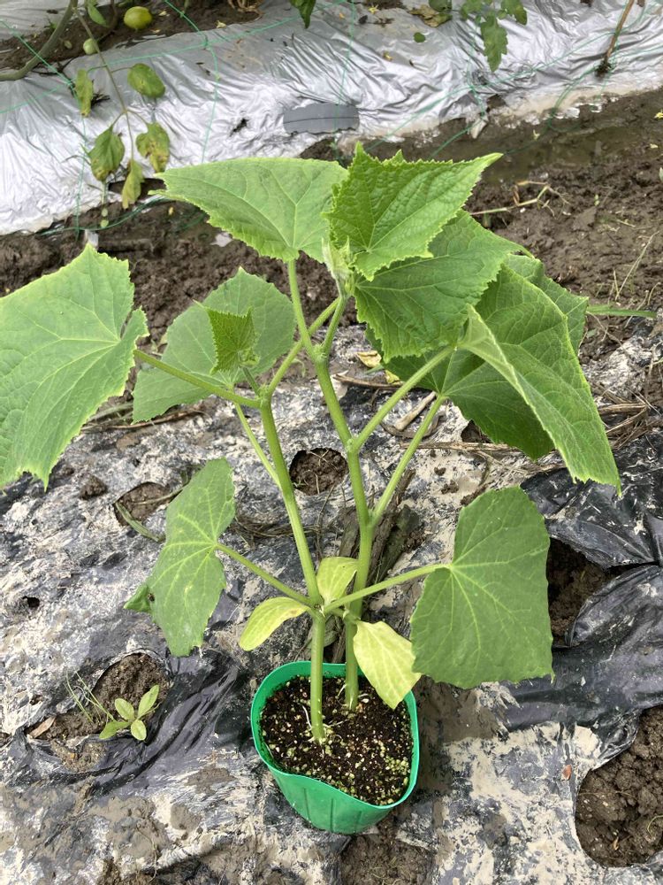 四葉きゅうりはまだ収穫できていますが、晩生玉ねぎの跡地に育苗した地這キュウリの苗を植えつけしました。