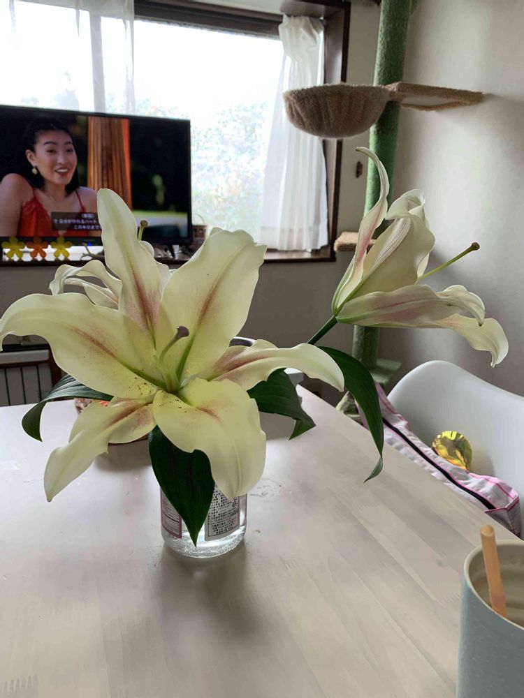 カサブランカを部屋に活けるとキッチンリビング一体の狭い家、食事時は香りが濃すぎて端っこによけるくらい🤣