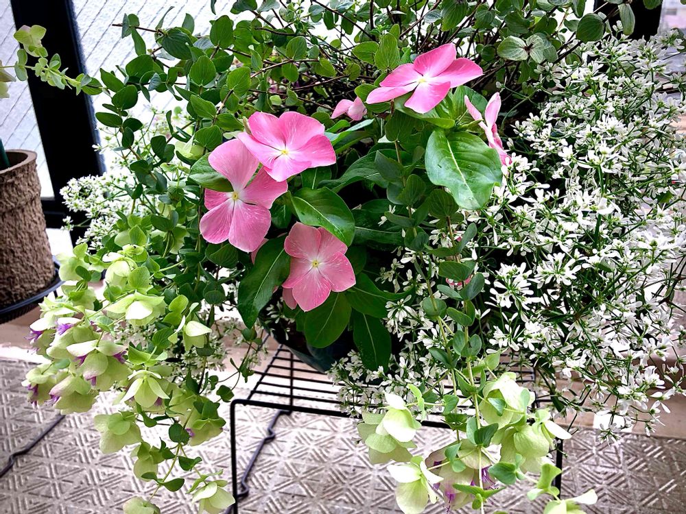 ベランダでハンギングの寄せ植えユーフォルビアダイヤモンドスノー,日々草桃色のときめき,オレガノケントビューティが綺麗に咲いてくれています。