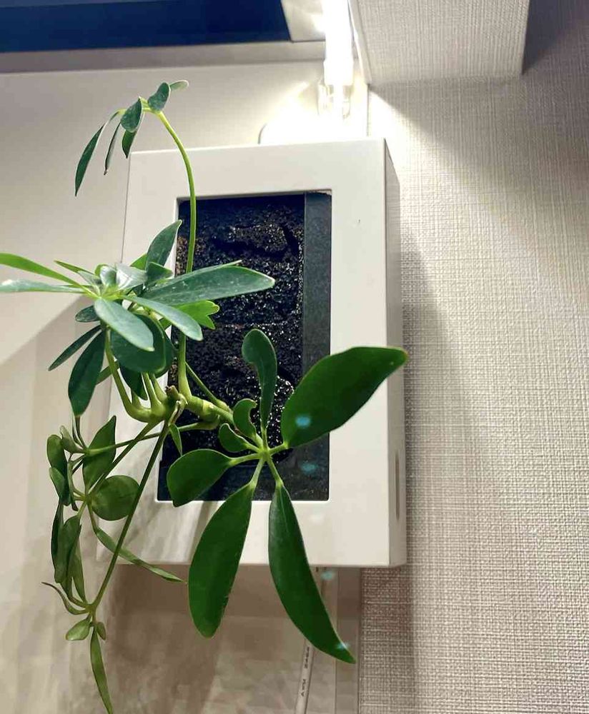 pic5 無印良品の壁掛け植物コンテナ。空き地の上の部分に植えようと子株を育てている。一度根が1mm位出たオリヅルランを移したら数日で根付かず枯れた。今度はもう少し根の状況を見て選んで定着してほしい。