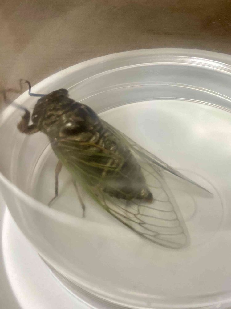 玄関の前で、うごめいている、黒の、塊、なんだ!ってよく見たら、蝉、捕まえても、鳴かなかったので、雌です。