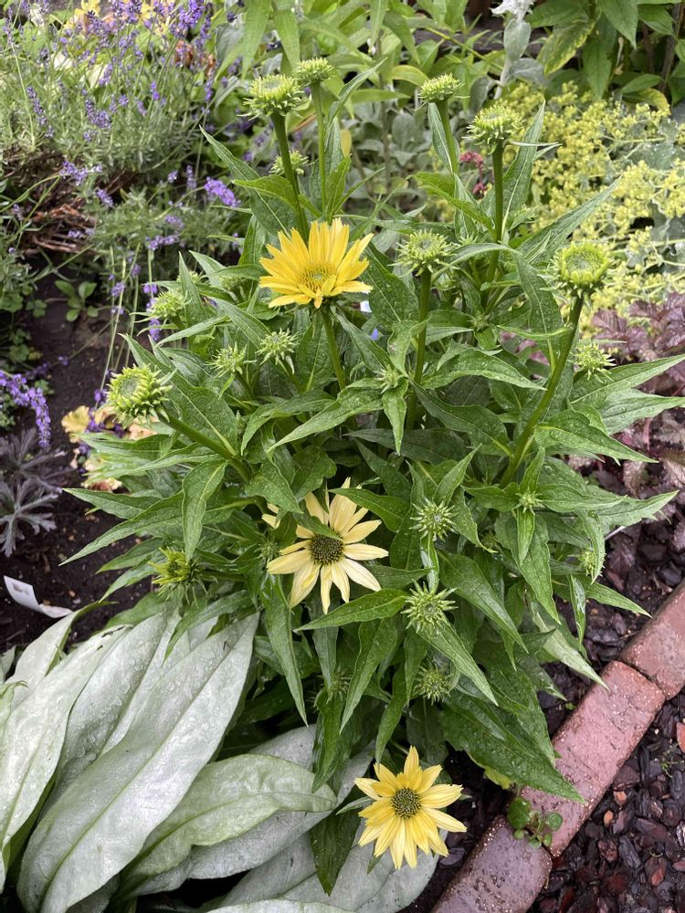 もう一枚、雨の中次々と咲きはじめたエキナセア メローイエロー