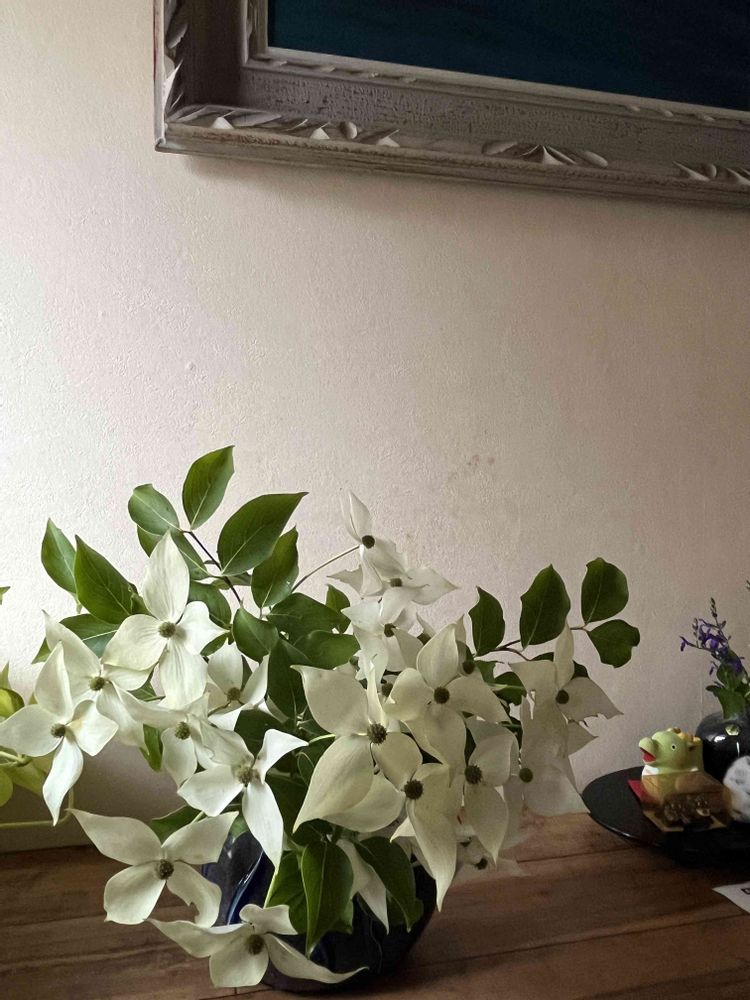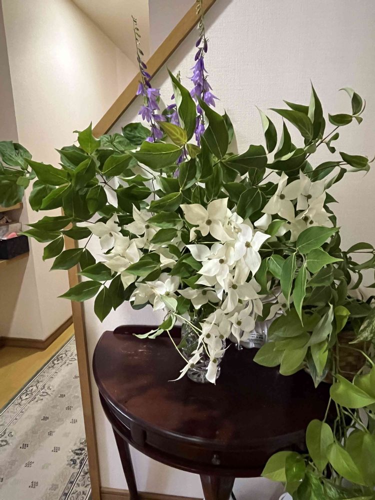 今日庭の樹木の剪定をしました その中のミルキーウェイ(ヤマボウシ)も花が付いていましたが剪定し②③④家の中のあちこちにカットした花を生けました いつも庭で咲いて居るのとは違った顔を見せてくれました