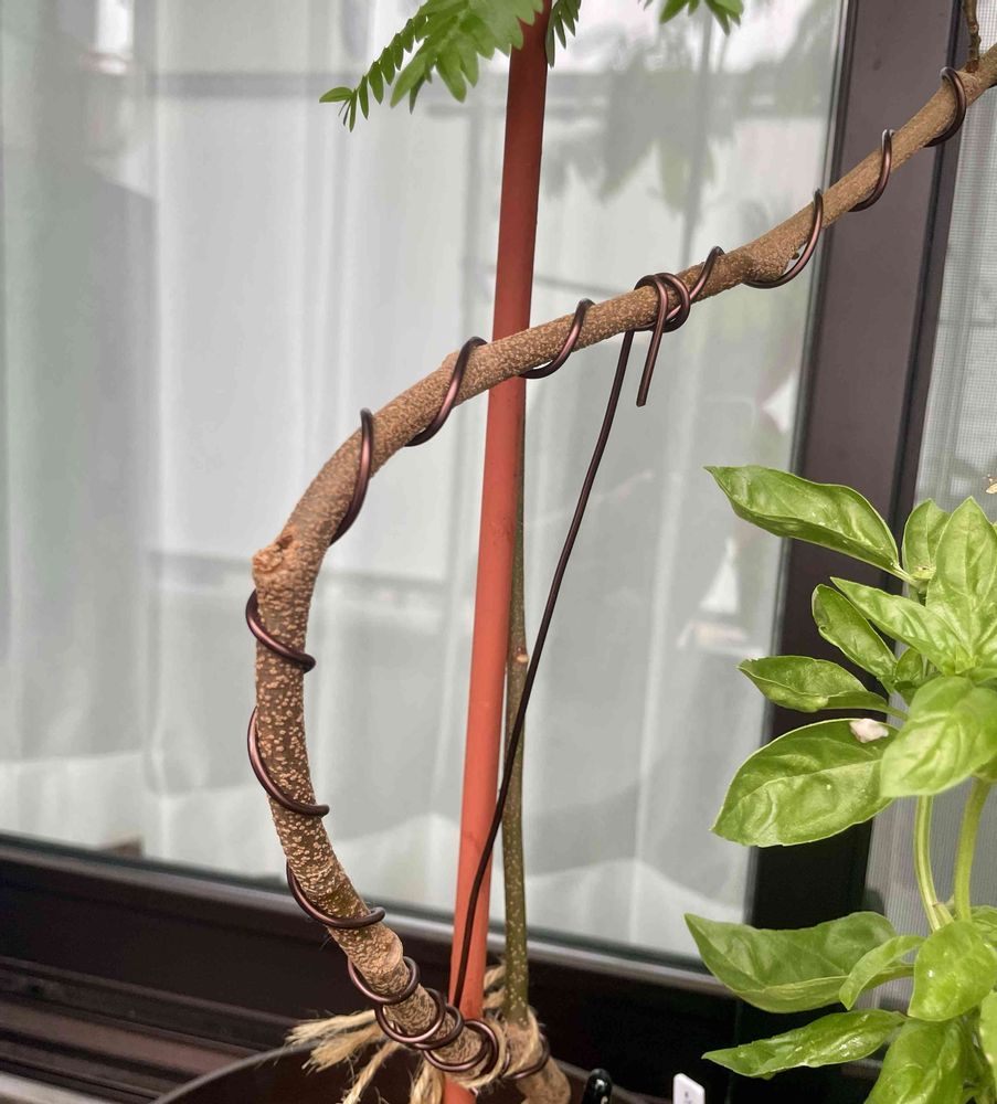 購入時に曲がっていた部分から上にも曲がってほしいので、気持ち緩めにアルミ線をぐるぐる巻いて形状を整えている。外に出す数日前までは麻紐で曲がってほしい部分だけ引っ張っていたのだが、曲がり方が2Dじゃなくて3D にしたいので方法を変更。幹が太くなってもアルミ線が食いこなまいはずと見込んでいる。