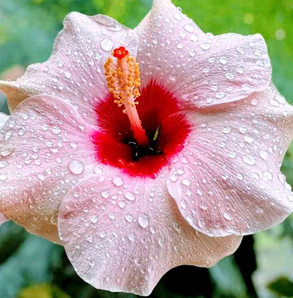 雨☔の滴をいっぱい抱えて、潤いを放つハイビスカス🌺の華やぎも、又素敵だなぁ🎵