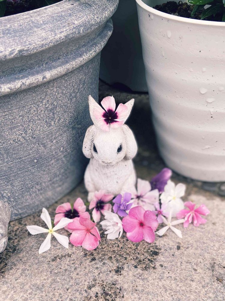 2枚目は朝はニチニチソウの花弁が沢山落ちているのでうさぎ🐰さんと…