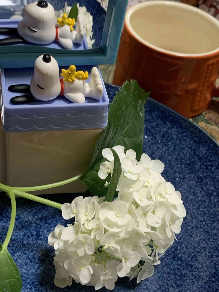今日も雨降り☔️スヌーピーちゃんはゆったりのんびり☔️アナベル見ながら😊でも鏡🪞見た方がいいんじゃない?お腹出てるよー🐽