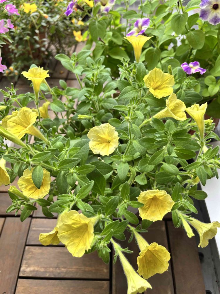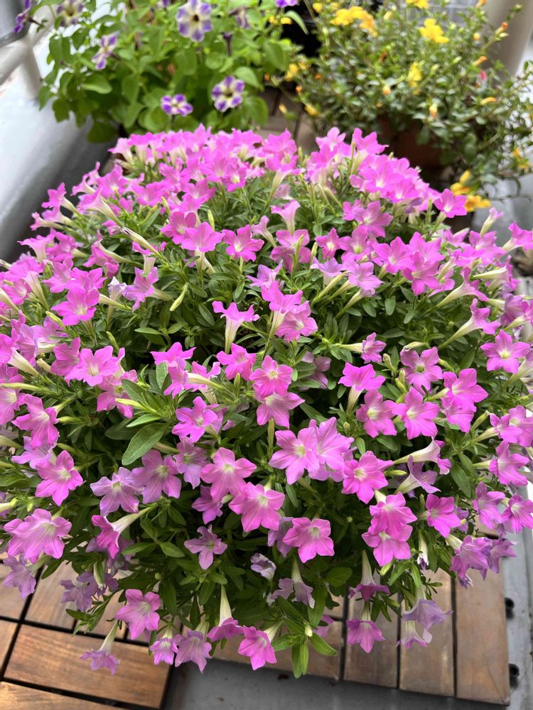 雨が上がりましたー明日、大阪は☀️だそうです😊 1️⃣5月末に切り戻した サントリーサフィニアブーケ・ゴールド✨やっと花が咲きだしました😅また花が見れて、ホッとします☺️ 2️⃣サントリーサフィニアプチさくらもこもこ✨こちらは6月初めに切り戻してから、また花が沢山咲いてくれて😆嬉しいです🎶