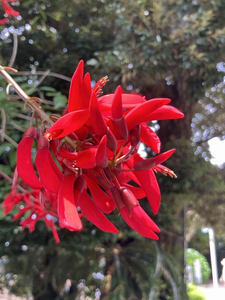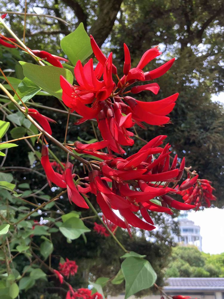 不思議な形容、蝶のようにも見えます。遠くからでも目立つ鮮やかな赤ですね💓