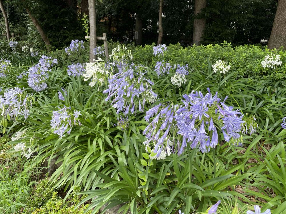 ④神社にて遠目で水色と白のアジサイが咲いていると空目しましたが、天候で倒れ気味のアガパンサスでした🩵🤍