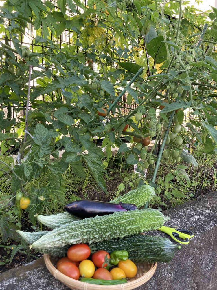 宿直明けの早朝、会社の花壇の夏野菜を収穫しました♪ゴーヤとミニトマトとシシトウが毎日よく取れますナスは初収穫🍆宿直明けのご褒美にいただきます😋