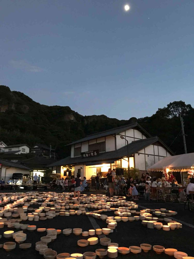 黄昏て、碧くなった山の向こうに月が浮かび、大小のボシ灯ろうの火が揺らいで、幻想的でした。