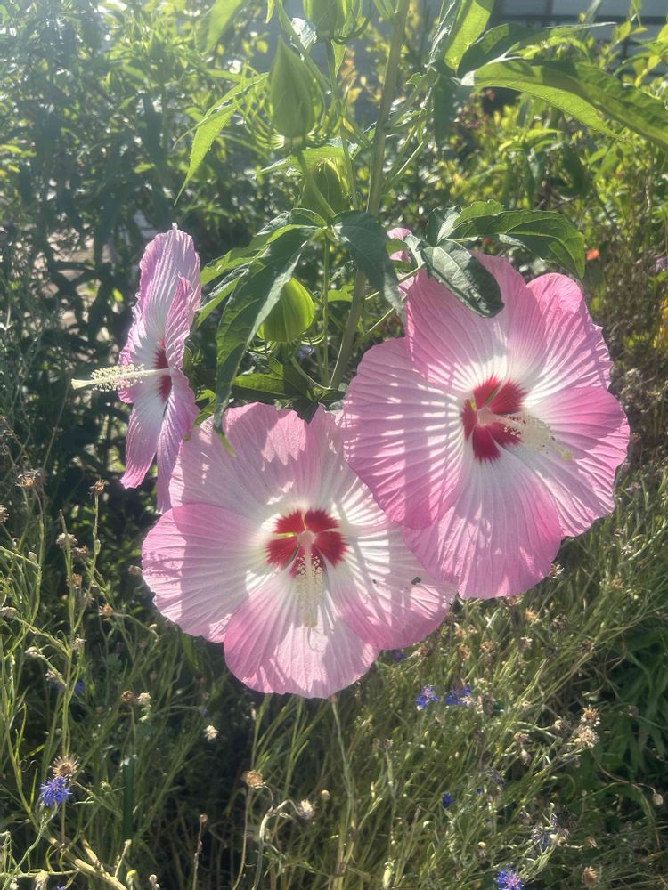 畑入り口右側の花壇のタイタンビカス、イリスが咲き始めました。西洋芙蓉ともみじあおいの新しい交配種です。冬は地上部は枯れますが、根が残っていて、毎年咲いてくれます。今年で3年目です。これも手間がかからず夏中次から次へと花を咲かせてくれます。