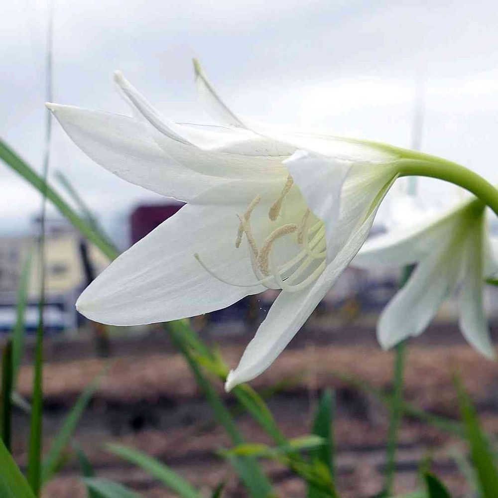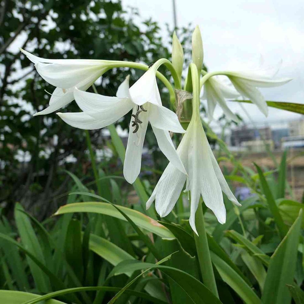 伸ばした花茎の先端に散形花序を出し、白い ユリ(白百合)のような漏斗状の花を多数咲かせる。