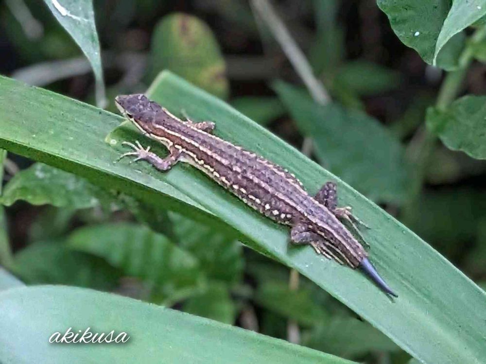下の葉っぱに目をやるとトカゲ(カナヘビ?)が…