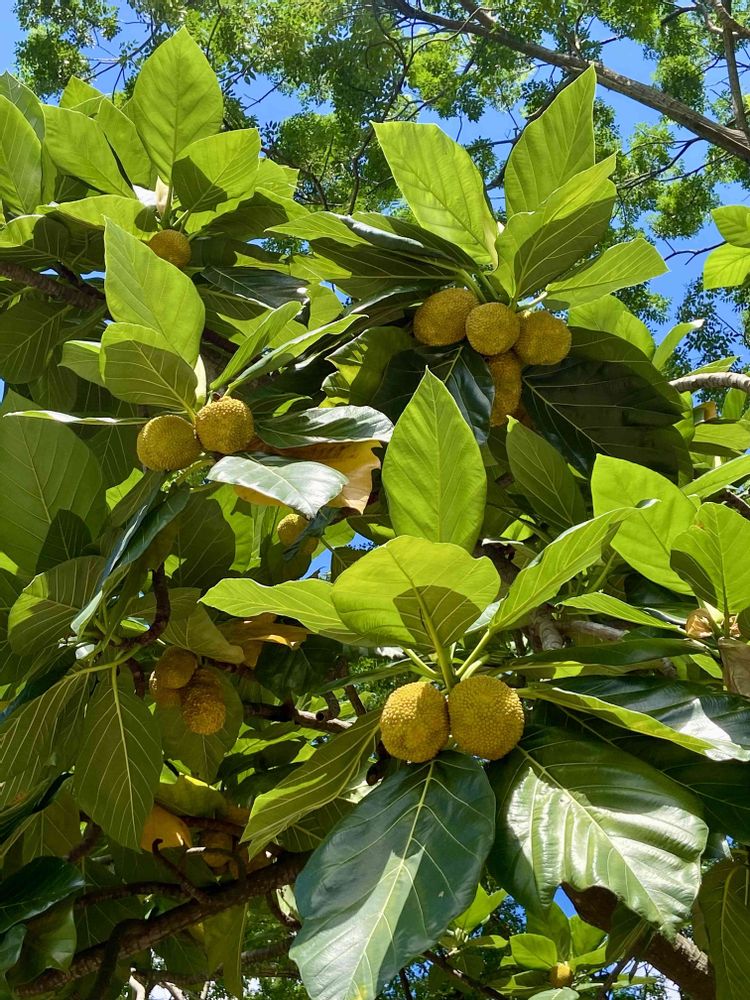 食べ頃判断の基準と収穫の仕方を今度聞いて来ますね。😉💛 大きなパンの木の下にはよく熟れて落ちたパンの実がグシャッと潰れて発酵臭がしてるのを目にすることもあるけれど、大きな木なので登って穫れるとも思えないんですよね。🤔