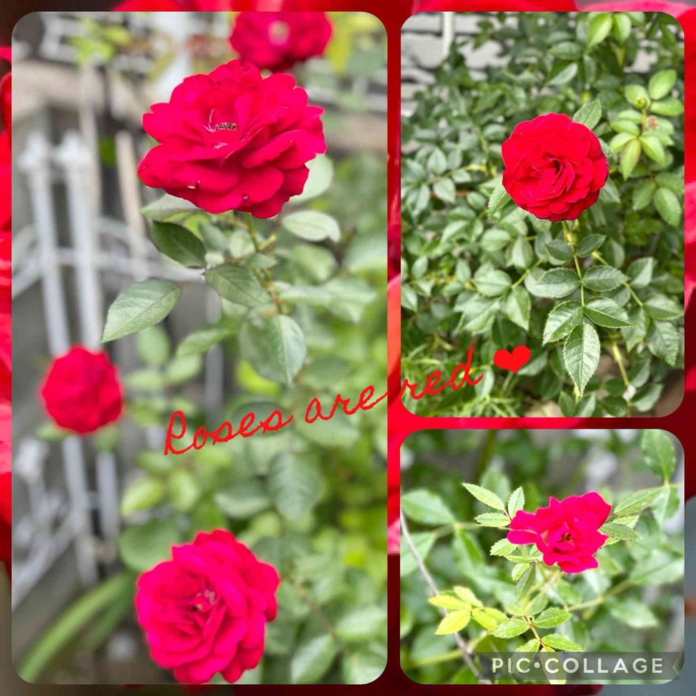 赤の二番花たち4種(見えませんが背景にも🥰)。暑さに強い赤いバラ、見るたび元気をくれます♥️
