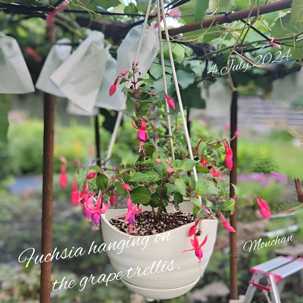 フクシアを葡萄棚に🍇モンちゃん庭ならではのアイデアですね🥰
