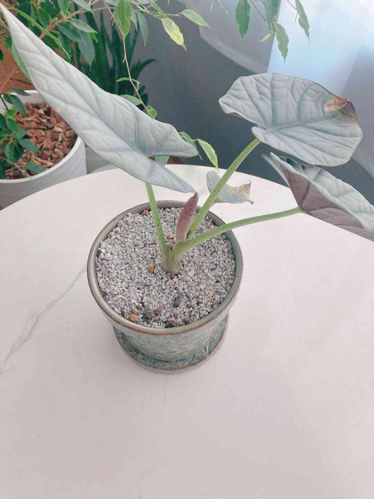 お迎えしてからなかなか新芽が出てこなかったアロカシアですが、ついに出てきました🌱
