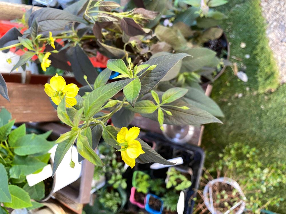 近所の方からいただきました黒葉の植物で下向きに黄色の花を咲かせてます