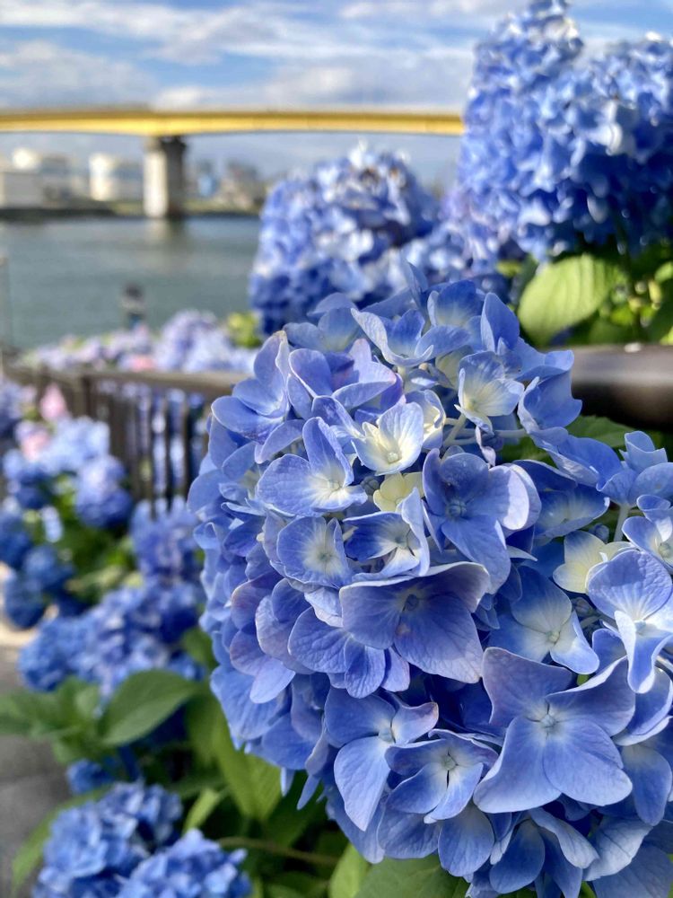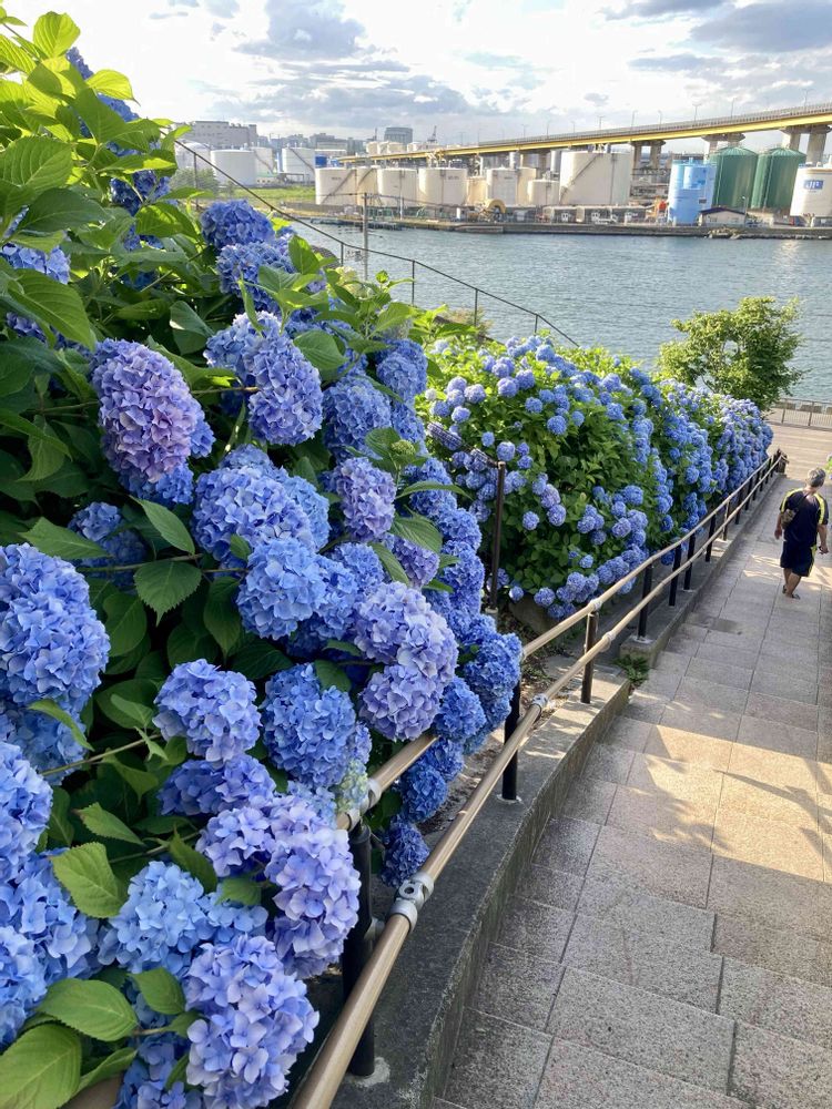 館鼻公園の階段のアジサイ、初めて見に行きました。青、青、紫、たまにピンク。写真では伝えきれない壮観さ。見に行って!
