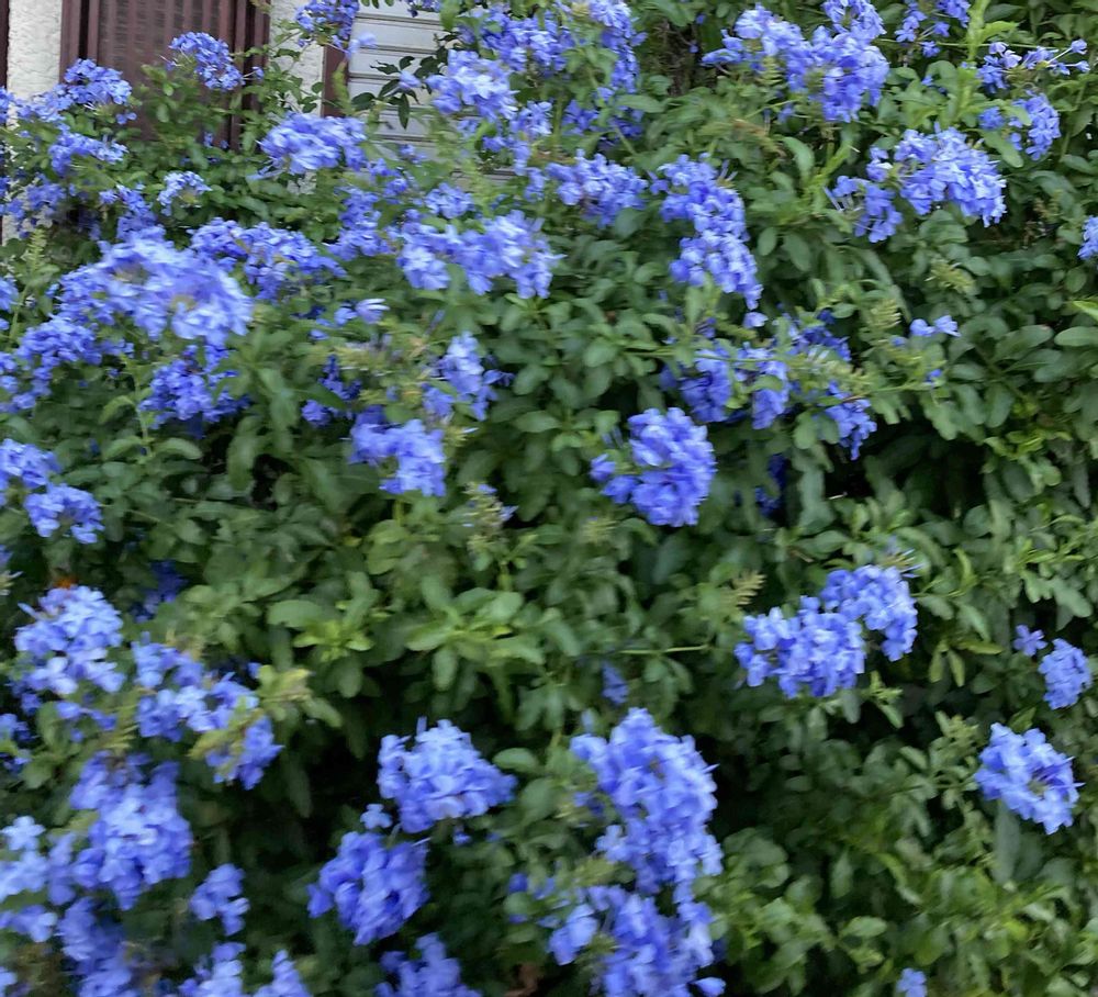 ここのルリマツリは屋根に届きそうなくらい立派です☺️