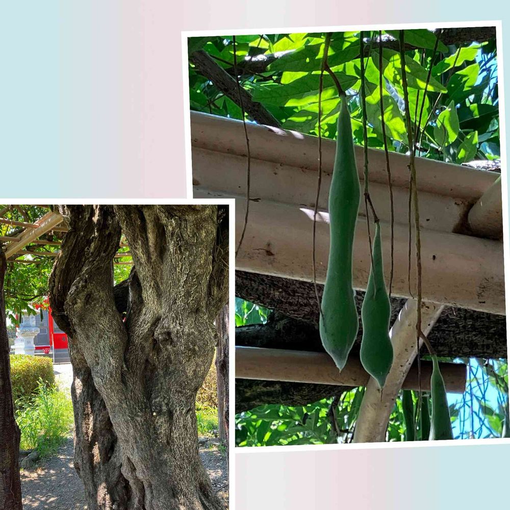 本殿前に藤棚 今は果実となって垂れている 気温35度 30分の散策でギブアップ 植物〜〜😅