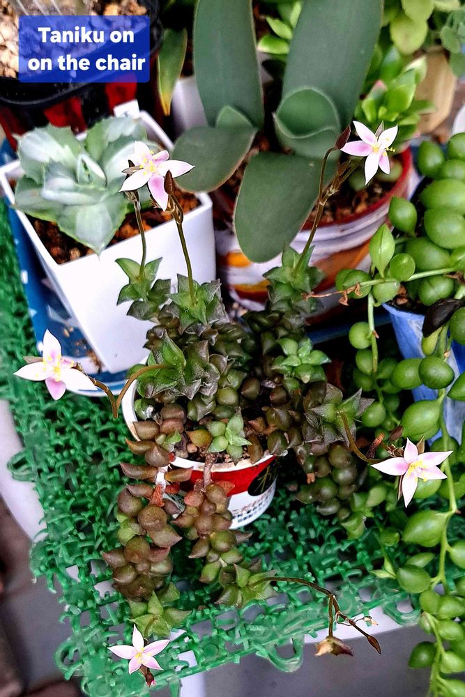 想定外に5ケ一気咲き🌸のアラクノイデス👽他、多肉VIPたちが👑アッシー様のベランダくつろぎイス💺を不法占領~❗🈵️😡