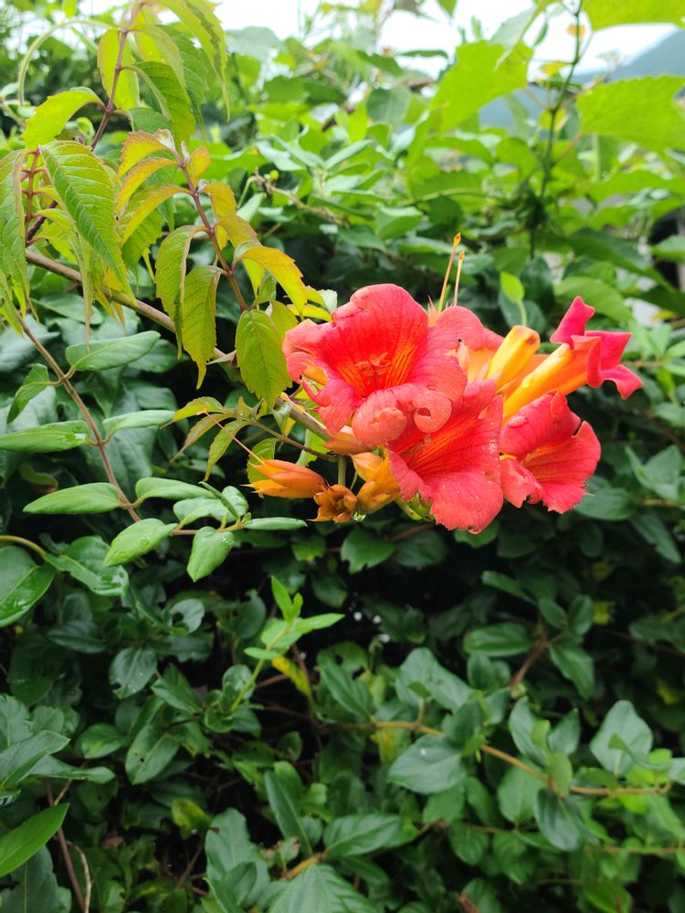 イヌマキの所に今年もノウゼンカヅラの花が咲きました✨