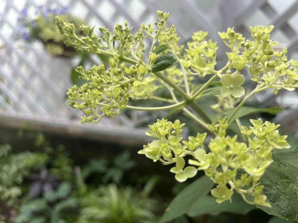 ピラミッド紫陽花もやっと開花始めました〜こちらも画壇に鉢植えのまま半地植えです🌿