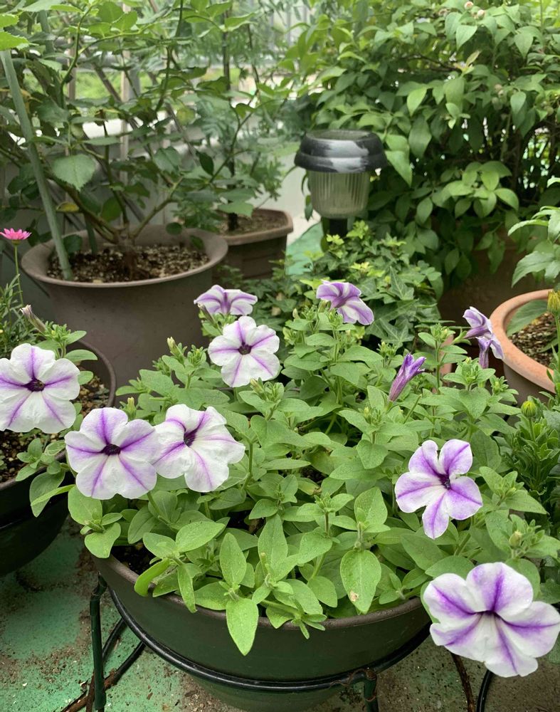 ペチュニアやカリブラコア、本当は苦手なので少ししか育ててません、その分挿し芽したりどうなるのかやってみてます、実はもう1鉢小さいのも挿し芽してるんです