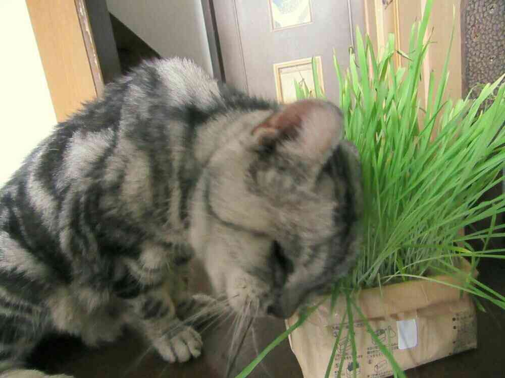 伸びきった猫草をどうにかして食べようと試行錯誤し、結果頭から突っ込んでいった模様。