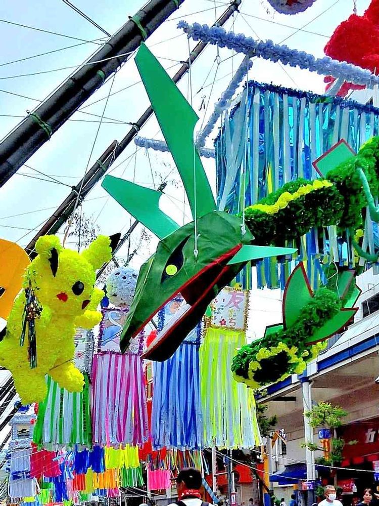 この七夕飾り。左右から長いポールで吊り下げている様ですが、クレーン車じゃ無い様です。専用のポールが据えつけてあるのでしょうか?