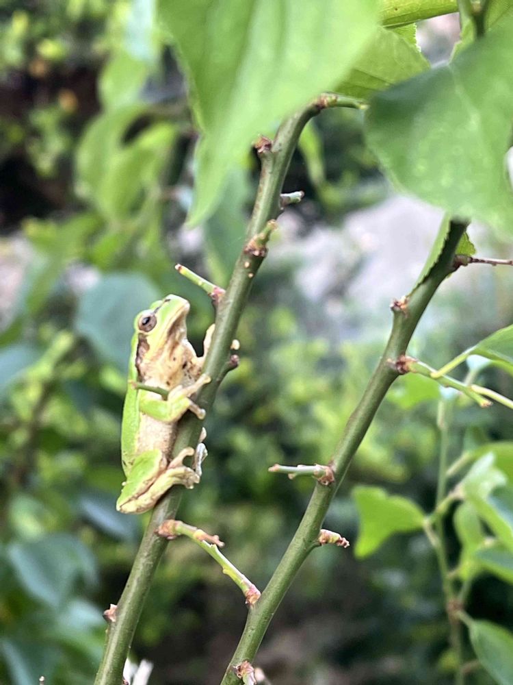 カエル🐸くん、まったりしている姿が多いのですが、木登りしているの撮ったのは初めてです😍