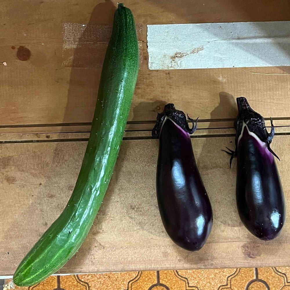 キュウリ🥒とナス🍆を先ほど収穫しました😆👍🥒🍆 キュウリがすごく長くて大きいです😆😆👍🥒🥒