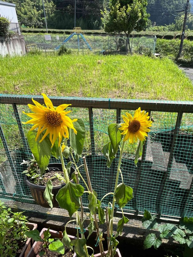 おはようございます。晴れ、28.1℃、ムシッと暑い。ウクライナひまわり3世、81日目揃い咲きです。バターナッツかぼちゃ2世、82日目デカい雌花ができました、明日は人工受粉できるかなぁ〜。つるありインゲン、52日目、実が大きくなってきました、早く収穫したあなぁ〜。松葉ぼたん、52日目たくさん発芽、育ってます。😻😍🥰😸😋☺️