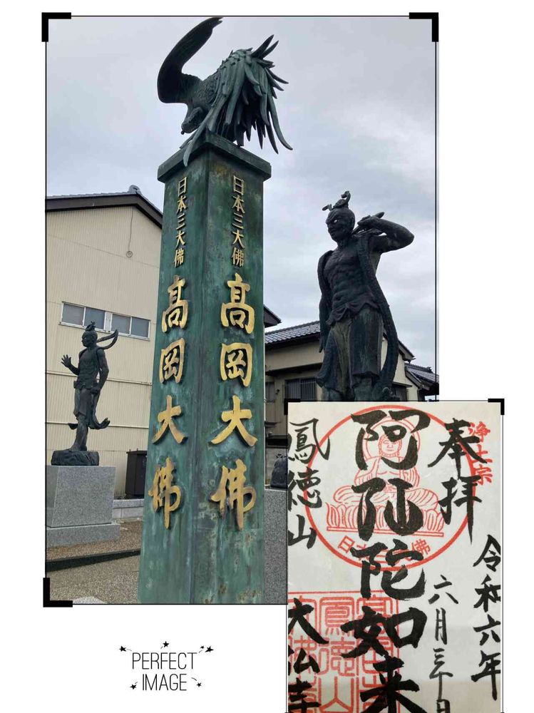 奈良、鎌倉と並んで有名な、大仏寺(尼寺)所有の大仏。創建は延享2年(1745)だが、幾度かの焼失を経て現在の大仏は昭和8年(1933)に建立された銅造阿弥陀如来座像。総高15.85m、総重量65トン、4.54mの大円輪光背がそびえる堂々とした姿は、高岡銅器職人の傑作といえる。歌人・与謝野晶子が「鎌倉大仏より一段と美男」と誉めたたえたことでも知られるらしい