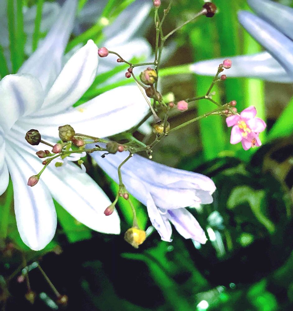 小さなサンジソウ、アガパンサスに守られて安心ですね🌸