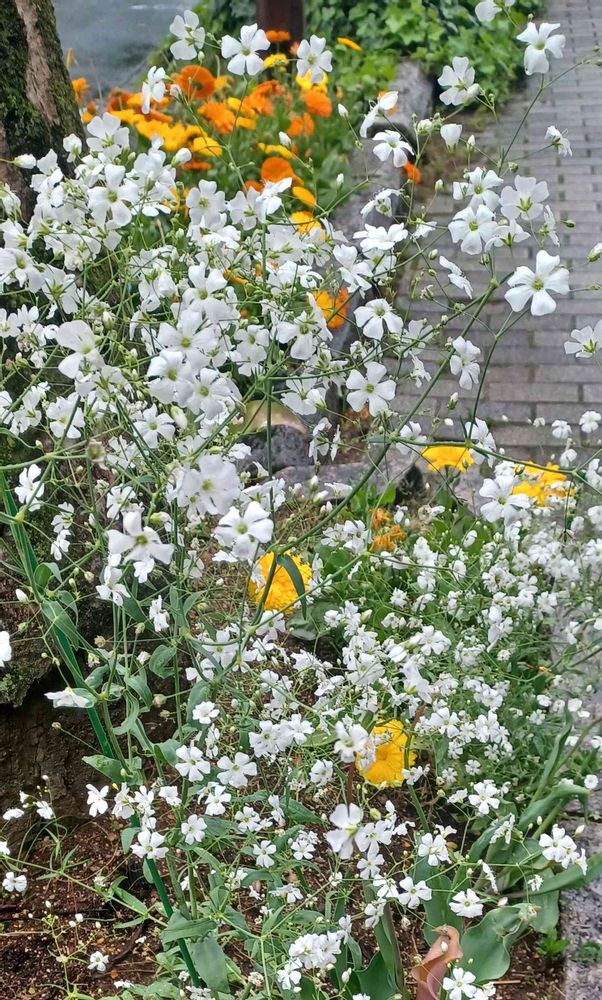 間に見える、キンセンカが、差し色のようで可愛いです。🤍🤍🤍💛🤍🤍🤍💛🤍🤍🤍