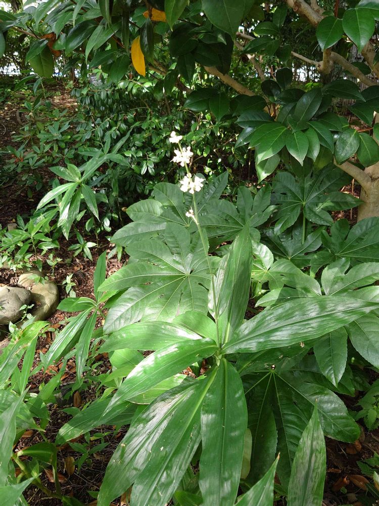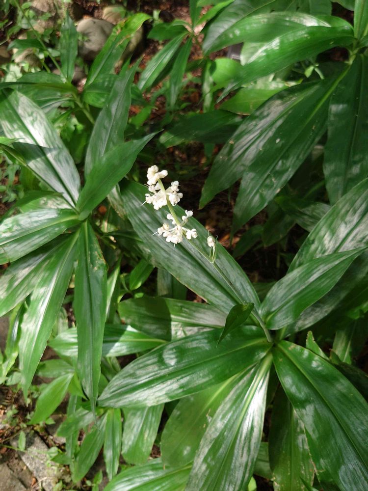 花は小さいけど、葉っぱはデカい🤭 ヤブミョウガというそうですね🔍 ヤクミにするミョウガとはアカの他人だそうです📖😮(農業試験場内にて)